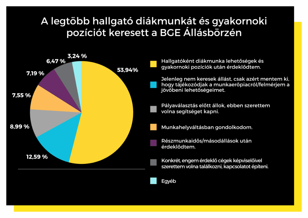 Kiemelkedő, hogy a látogatók több mint a fele (53,94%) gyakornoki pozíciók és diákmunkák iránt érdeklődött. Őket követték azok a hallgatók, akik tájékozódni mentek ki a munkaerőpiacról (12,59%), illetve a pályaválasztás előtt állók (8,99%).