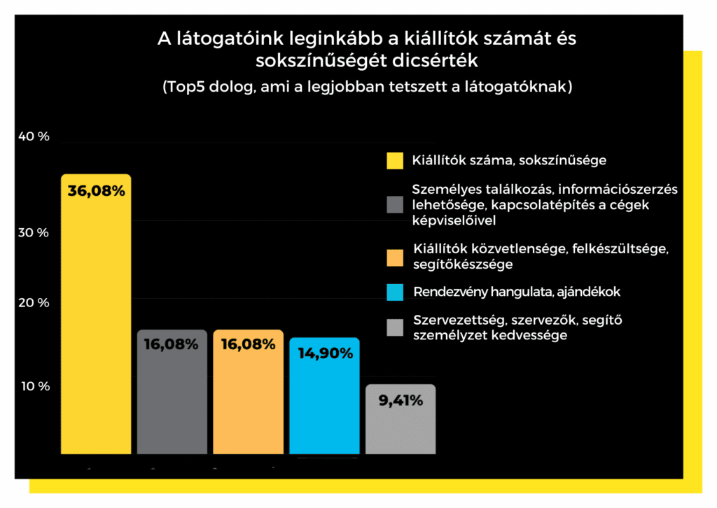 A látogatók több mint harmada (38,08%) a kiállítók számát és sokszínűségét emelte ki. Ezt követően azonos arányban (16,08-16,08%) kiemelték még a személyes találkozás, a kapcsolatépítés lehetőségét, valamint a kiállítók közvetlenségét és felkészültségét is.